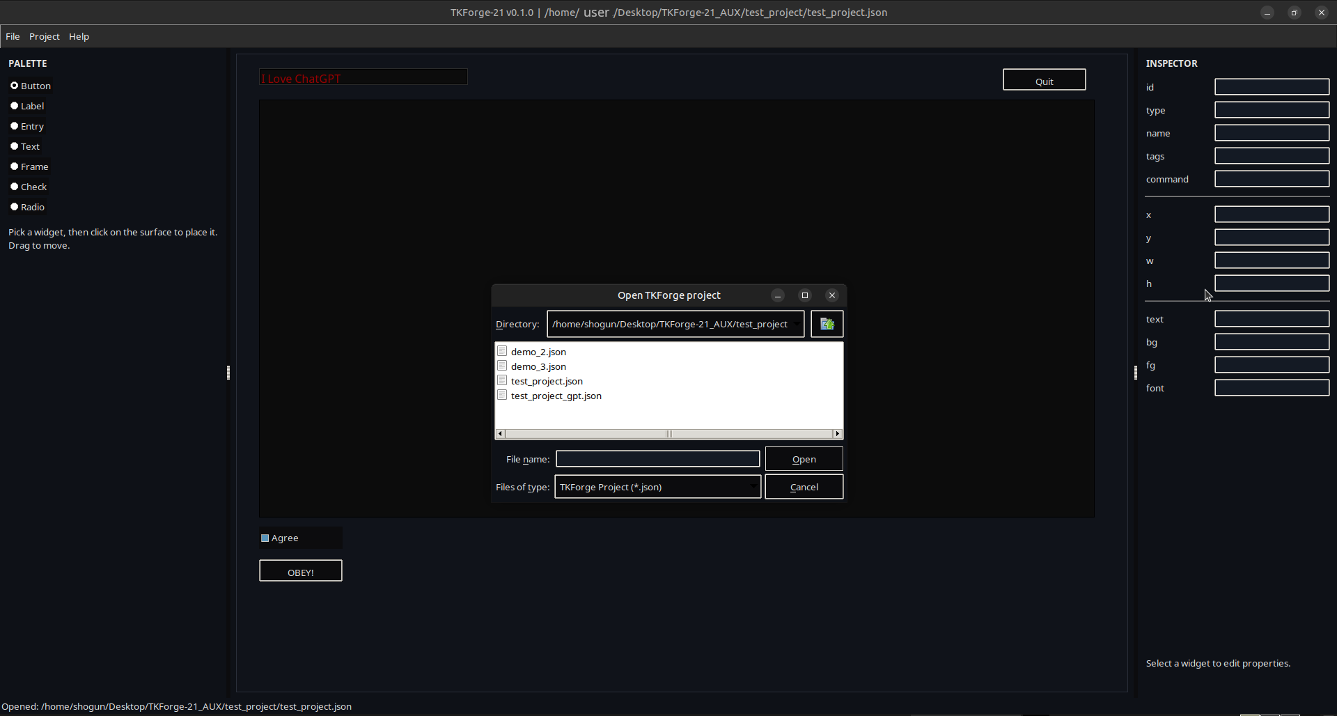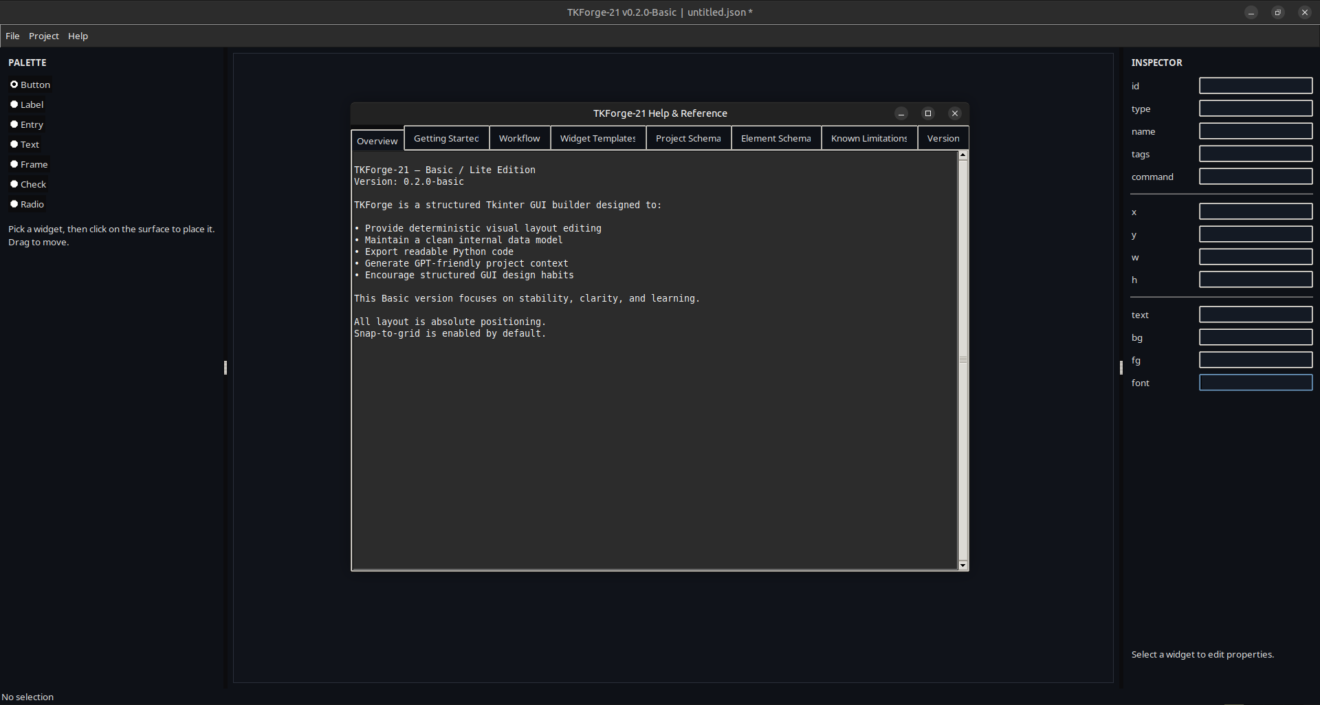 TKForge-21 Basic (Lite) is a beginner-friendly GUI builder for Python that helps you learn, prototype, and iterate faster. Create widgets on a canvas, edit properties in an Inspector, preview instantly, and export structured outputs designed to work beautifully with ChatGPT.